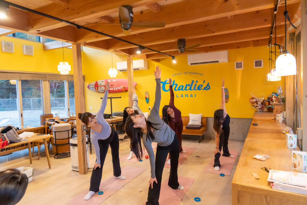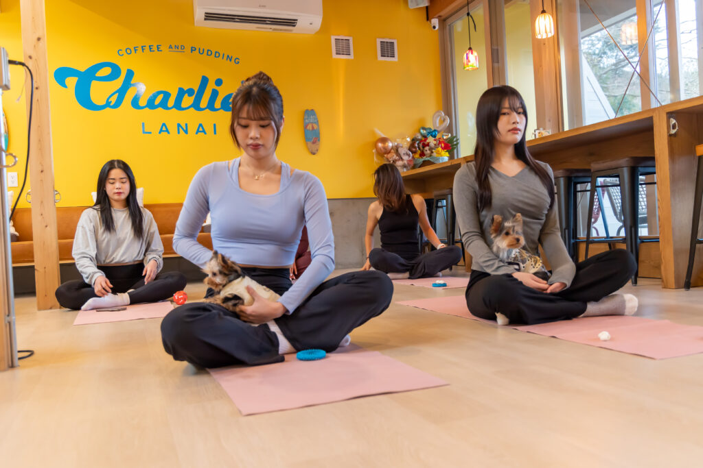 ハワイアンスタイルのカフェ・チャーリーズラナイさんのお店をお借りして、ヨガ・ピラティスの体験、そして美味しい食事が楽しめる。前田犬舎さんの可愛いワンちゃん達と心おきなく触れ合える!ここでしか体験できない特別な子犬イベント です。