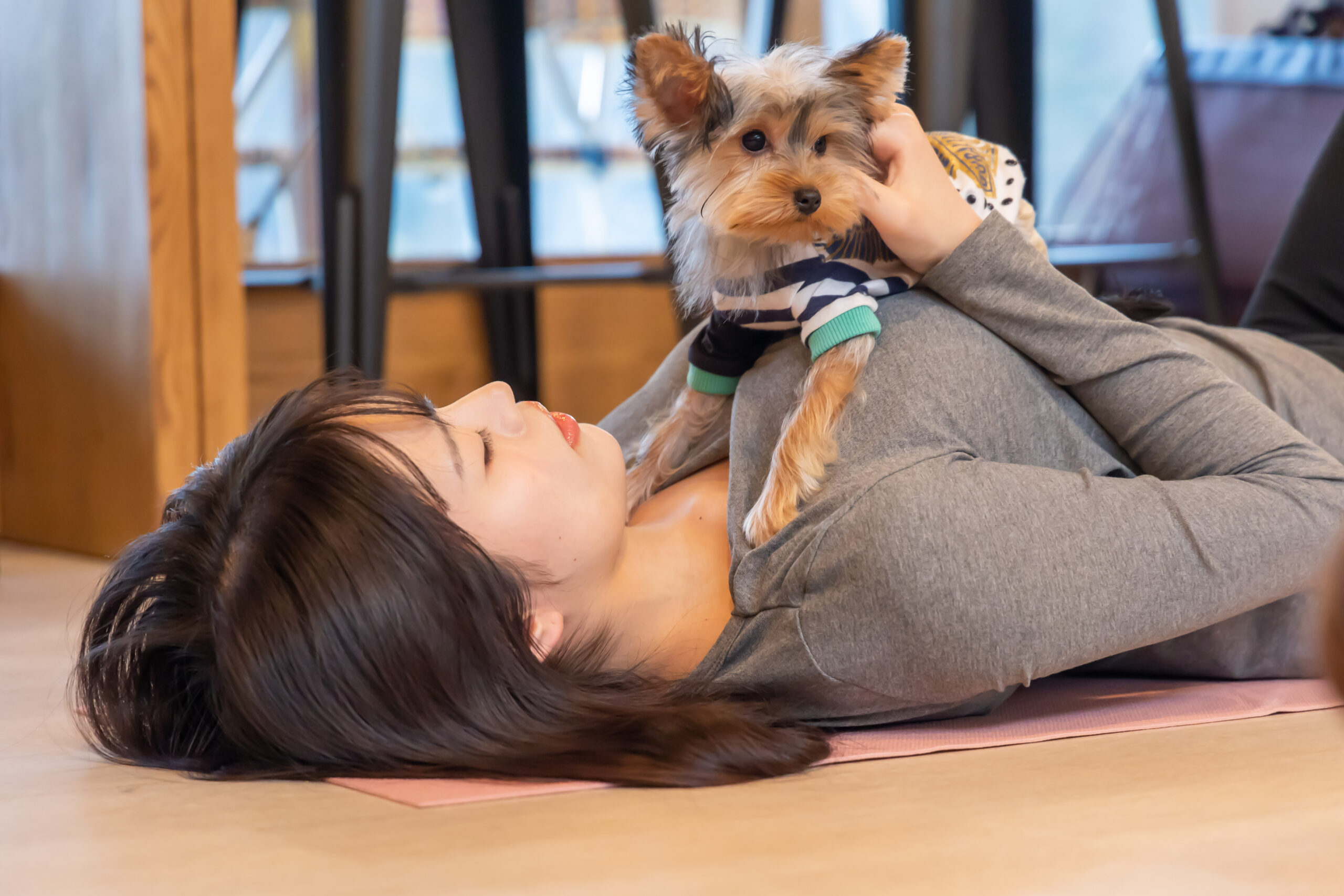 ヨガマットの上を子犬が歩いたり、そっと寄り添ってくれたり。 その自然なふれあいが、